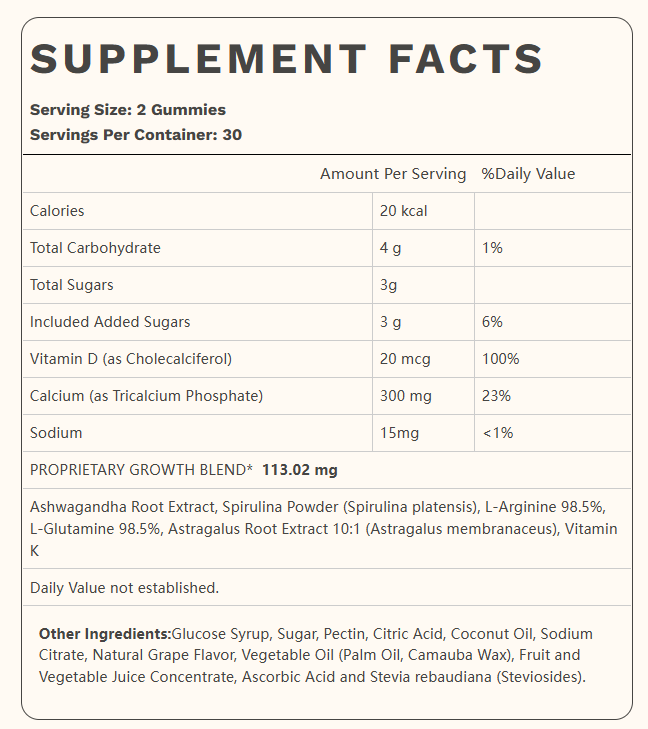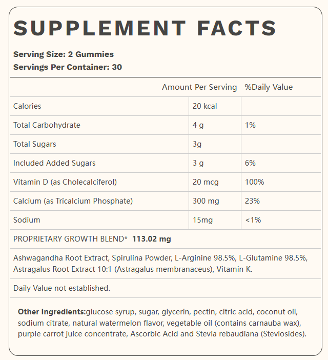 - Growth Gummies: Are a great option for younger children or those who might have difficulty swallowing capsules. They come in a tasty watermelon or grape flavors, making them more palatable and enjoyable to consume.