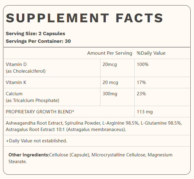 TruHeight® Growth Gummies/Capsules stand out with a unique blend of ingredients specifically designed to support bone strength and healthy development in kids and teens. The formulation includes traditional herbs like Ashwagandha, known for promoting normal hormone responses, alongside other nutrients chosen for their growth-supporting properties.